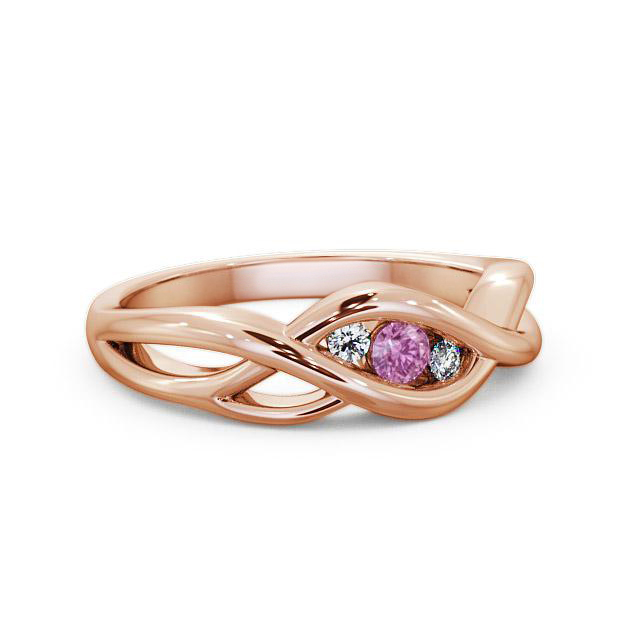 Adler three stone pink sapphire and diamond 0.13ct ring in a 9K Rose Gold setting. Showcasing twisted design this three stone ring features a single 0.09 Carat round shaped pink sapphire gemstone in the centre accompanied by two round shaped 0.04 Carat total weight sparkling diamonds. This ring is available in a range of metal options with AAA grade gemstone. We offer a free design service for any customised changes that you may require.