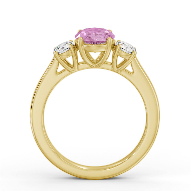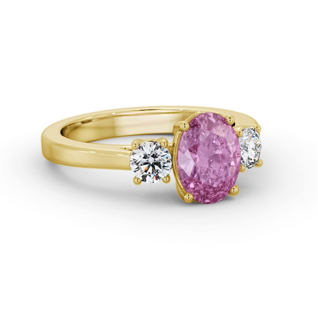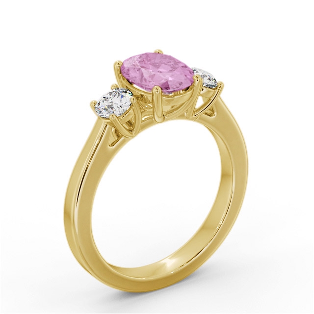 Felicia three stone pink sapphire and diamond 1.95ct ring in 18K Yellow Gold. The 1.55 carat oval pink sapphire in the centre of this classic and beautiful ring is flanked on either side by 0.40 carats of round shaped diamonds. This ring is available in a variety of metal types and your choice of natural or lab grown gems. We provide a free design service for any special modifications that you may require.