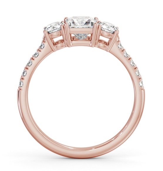 Elisa three stone diamond trilogy ring in a 18K Rose Gold setting. This ageless three stone engagement ring flaunts three princess shaped diamonds and a row of smaller round diamonds flowing down each side of the shoulder. Smaller diamonds will be of standard quality VS1 Clarity and F Colour. This ring is available in a range of metal options and your choice of natural or lab grown diamonds. We offer a free design service for any customised changes that you may require.