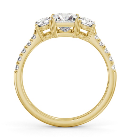 Elisa three stone diamond trilogy ring in a 18K Yellow Gold setting. This ageless three stone engagement ring flaunts three princess shaped diamonds and a row of smaller round diamonds flowing down each side of the shoulder. Smaller diamonds will be of standard quality VS1 Clarity and F Colour. This ring is available in a range of metal options and your choice of natural or lab grown diamonds. We offer a free design service for any customised changes that you may require.