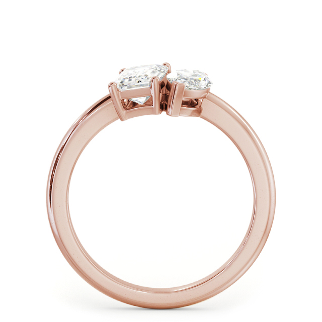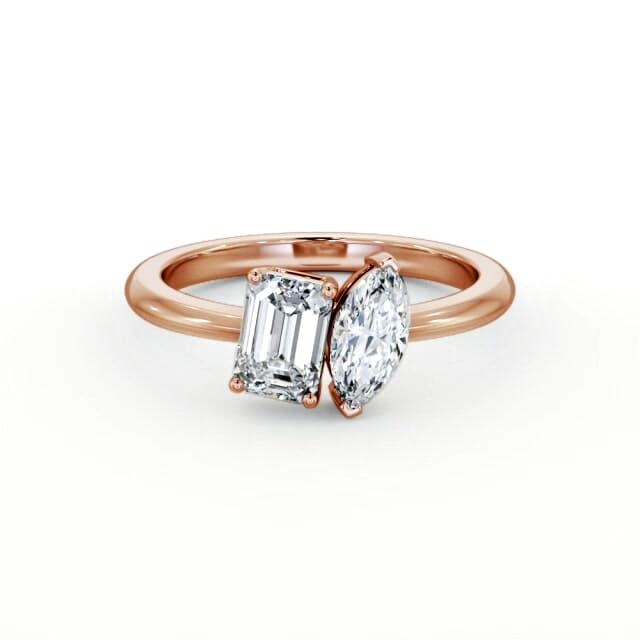 Lavenis two-stone diamond Toi et Moi ring, expertly crafted in 9K rose gold. This design highlights a stunning combination of an emerald-cut diamond and a marquise-shaped diamond. The angular structure of the emerald contrasts beautifully with the soft curves of the marquise, creating a modern and refined look. Available in a variety of metal options, with a free customisation service to help personalise the design to your preferences.