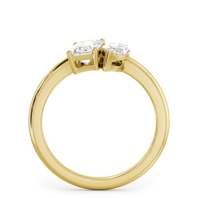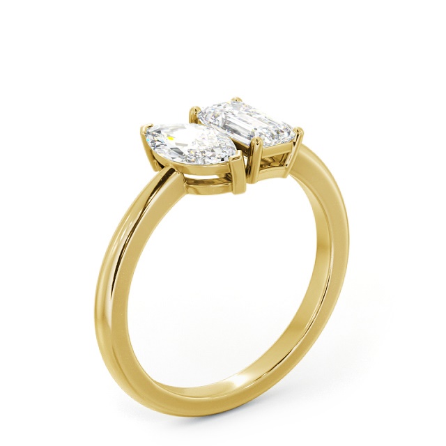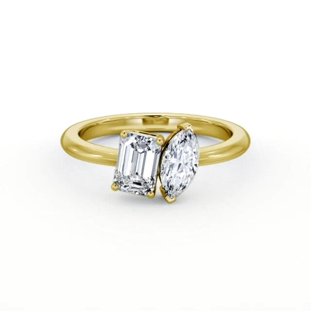 Lavenis two-stone diamond Toi et Moi ring, expertly crafted in 9K yellow gold. This design highlights a stunning combination of an emerald-cut diamond and a marquise-shaped diamond. The angular structure of the emerald contrasts beautifully with the soft curves of the marquise, creating a modern and refined look. Available in a variety of metal options, with a free customisation service to help personalise the design to your preferences.
