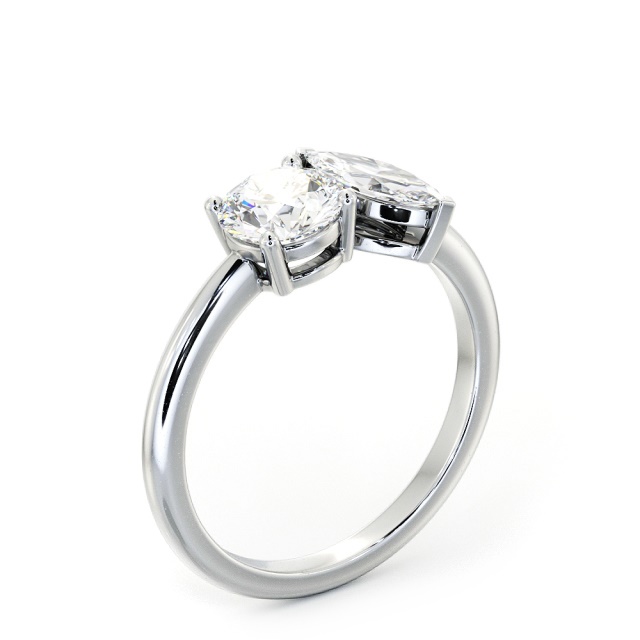 Jamila two-stone diamond Toi et Moi ring, crafted in platinum, showcases a beautiful blend of a round diamond and a marquise diamond. The combination of these two contrasting shapes gives the ring a distinct character, merging timeless elegance with modern flair. This design is available in a variety of metals, with an option for free customisation to suit your style.