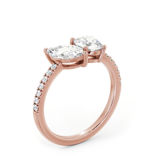 Jesita two-stone diamond Toi et Moi ring, crafted in 18K rose gold. This enchanting design features a stunning round diamond paired with a marquise diamond as its focal point, highlighted by a band lined with sparkling smaller round diamonds. The side diamonds total approximately 0.15ct, with VS1 clarity and F colour. It is available in a variety of metal options, with a complimentary customisation service to personalise the design to your preferences.