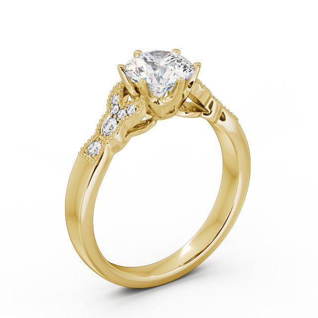 Florence vintage diamond engagement ring with a six claw 18K Yellow Gold setting. Chic and sophisticated, this intricately detailed engagement ring showcases a large centre round diamond flanked by sparkling smaller round diamonds in milgrain patterned shoulders. The diamond side stones are an approximate total of 0.10ct with Clarity VS1 and Colour F. This ring is available in a range of metal options and your choice of natural or lab grown diamonds. We offer a free design service for any customised changes that you may require.