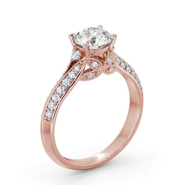 Bentley diamond engagement ring with a four claw 18K Rose Gold setting. Elegant and stunning, this vintage-inspired engagement ring displays a four-prong set centre round diamond with milgrain edged leaves and a split shank design, all embedded with small round diamonds. Total diamond side stones weigh approximately 0.30ct with Clarity VS1 and Colour F. This ring is available in a range of metal options and your choice of natural or lab grown diamonds. We offer a free design service for any customised changes that you may require.